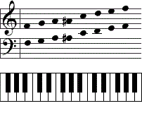 Here's a simple example of sheet music played on a piano - the scale of "f" played on two octaves:
